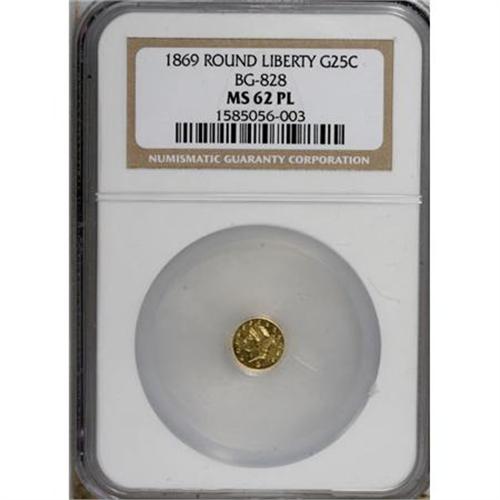 <B>1869 25C BG-828 MS62 Prooflike NGC.</B></I> NGC Census: (2/1). PCGS Population (0/0). (#710689)<BR><BR><b>Shipping:</b> Coins & Currency (<a target="_blank" href="http://www.heritageauctions.com/common/shipping.php">view shipping information</a>)