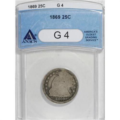 <B>1869 25C G4 ANACS.</B></I> NGC Census: (0/18). PCGS Population (0/21). Mintage: 16,000. Numismedia Wsl. Price for NGC/PCGS coin in G4 : $229. (#5474)<BR><BR><B>Coin Engraver:</B> Christian Gobrecht<BR><BR><b>Shipping:</b> Coins & Currency (<a target="_blank" href="http://www.heritageauctions.com/common/shipping.php">view shipping information</a>\)