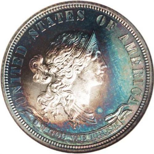 <B>1869 25C Standard Silver Quarter Dollar, Judd-727, Pollock-808, R.5, PR67 <img border='0' src='http://www.heritagecoins.com/images/star.gif' width=10 height=10> Cameo NGC.</B></I> Liberty's hair is bound, and she wears a diadem. The obverse exergue displays IN GOD WE TRUST within a scroll. A small oak and laurel wreath crowds the centrally placed 25 CENTS. STANDARD SILVER and the date complete the reverse legends. Struck in silver with a reeded edge. An exactingly struck Superb Gem with beautiful ocean-blue, ruby-red, and gold toning.<BR><BR><b>Shipping:</b> Coins & Currency (<a target="_blank" href="http://www.heritageauctions.com/common/shipping.php">view shipping information</a>)