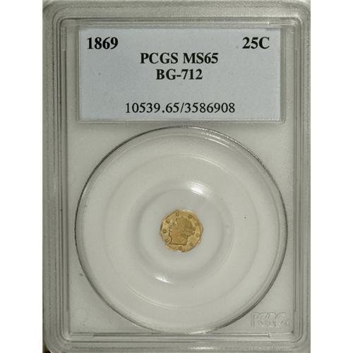 <B>1869 25C Liberty Octagonal 25 Cents, BG-712, High R.4, MS65 PCGS.</B></I> Pale apple-green margins surround the peach-tinged centers. This sharply struck and satiny Gem is impressively preserved. PCGS has certified only three pieces finer (3/07).<BR><BR><b>Shipping:</b> Coins & Currency (<a target="_blank" href="http://www.heritageauctions.com/common/shipping.php">view shipping information</a>)