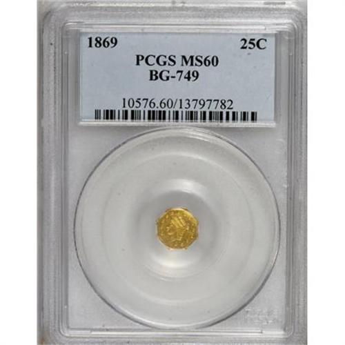 <B>1869 25C Liberty Octagonal 25 Cents, BG-749, High R.5, MS60 PCGS.</B></I> PCGS Population (2/19). NGC Census: (0/0). (#10576)<BR><BR><b>Shipping:</b> Coins & Currency (<a target="_blank" href="http://www.heritageauctions.com/common/shipping.php">view shipping information</a>)