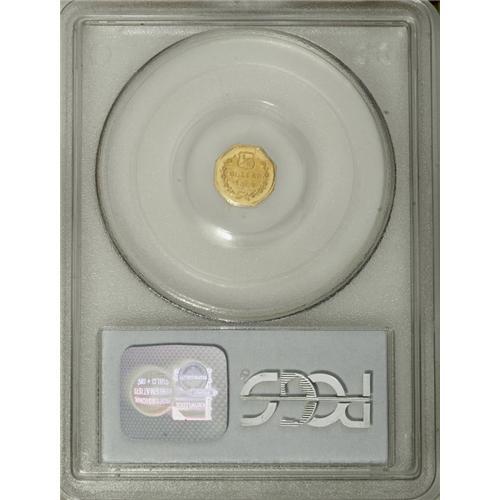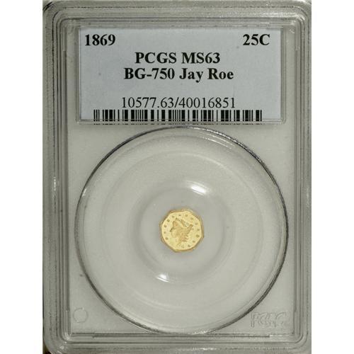 <B>1869 25C Liberty Octagonal 25 Cents, BG-750, R.5, MS63 PCGS.</B></I> Ex: Jay Roe. Rich peach patina dominates the field within the wreath, but the remainder of this brightly mirrored example is straw-gold. From perhaps the most famous collection of California fractional gold. Population: 5 in 63, 0 finer (3/07).<BR><I>Ex: Jay Roe Collection (Bowers and Merena, 9/03), lot 194.</B></I><BR><BR><b>Shipping:</b> Coins & Currency (<a target="_blank" href="http://www.heritageauctions.com/common/shipping.php">view shipping information</a>)