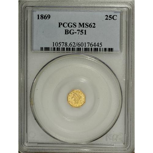 <B>1869 25C Liberty Octagonal 25 Cents, BG-751, High R.4, MS62 PCGS.</B></I> PCGS Population (12/18). NGC Census: (6/0). (#10578)<BR><BR><b>Shipping:</b> Coins & Currency (<a target="_blank" href="http://www.heritageauctions.com/common/shipping.php">view shipping information</a>)