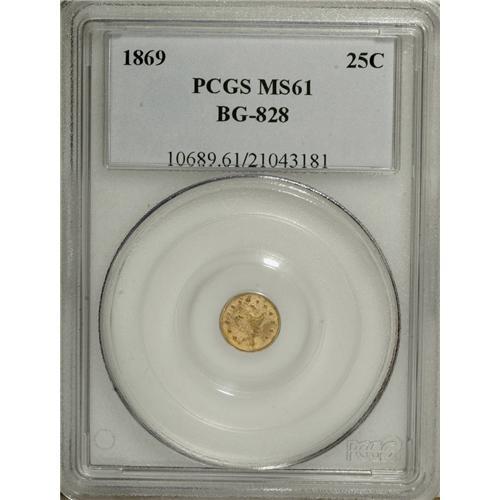<B>1869 25C Liberty Round 25 Cents, BG-828, High R.4, MS61 PCGS.</B></I> PCGS Population (7/33). NGC Census: (2/3). (#10689)<BR><BR><b>Shipping:</b> Coins & Currency (<a target="_blank" href="http://www.heritageauctions.com/common/shipping.php">view shipping information</a>)