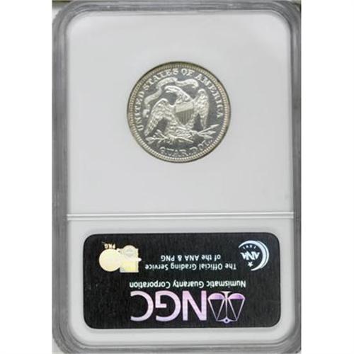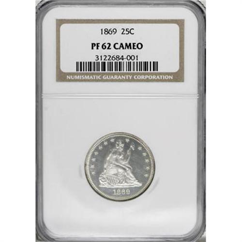 <B>1869 25C PR62 Cameo NGC.</B></I> This piece offers mild, yet distinct contrast between delicately frosted devices and shining, lightly toned mirrors. The obverse fields show a number of hairlines that account for the grade. Census: 1 in 62 Cameo, 12 finer (1/08).<BR><BR><b>Shipping:</b> Coins & Currency (<a target="_blank" href="http://www.heritageauctions.com/common/shipping.php">view shipping information</a>)