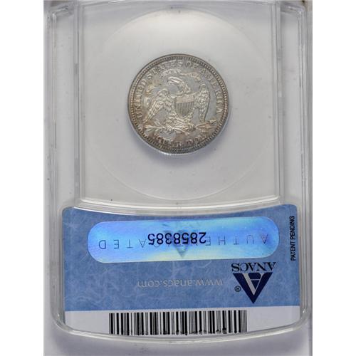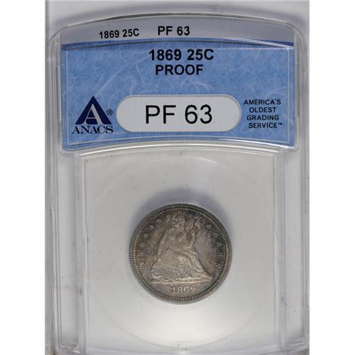 <B>1869<25C> PR63 ANACS.</B></I> A violet and red-orange specimen with moderate mirrors. Nicely struck, though two contact marks, one in the drapery and shield and another in the left obverse field, limit the grade.<BR><I>Ex: Stack's, 7/52, lot 446.</B></I><BR><I>From The Redfjord Collection.</B></I>