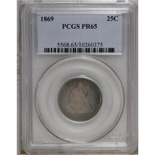 <B>1869<25C> PR65 PCGS.</B></I> Heavy rose and lavender patina all but obscure the mirrors, but the devices have the crisp strike that defines a proof. This Gem is a superior survivor from an original mintage of just 600 specimens. Population: 9 in 65, 3 finer (9/06).