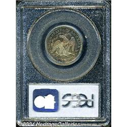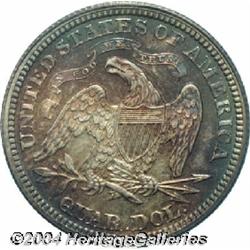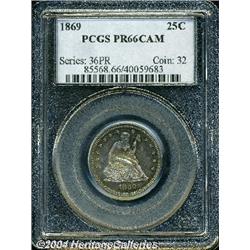 <B>1869<25C> PR66 Cameo PCGS.</B></I> A beautiful Gem proof, with originally toned surfaces that exhibit electric-blue, crimson, and antique-gold shades. Seemingly pristine, the fields are watery and deeply-mirrored. Conditionally rare at both of the major grading services as a cameo. Population: 3 in 66 Cameo, none finer (9/04). <BR><BR><B>Important notice:</B> Heritage usually auctions material at the rate of 200-250 lots per hour. On some occasions eBay Live bid software or the Internet may not be able to keep up with the pace of the auction. We recommend placing a realistic absentee bid now as insurance to avoid disappointment. Occasionally the auctioneer may eliminate or reject an eBay Live bid, and the auctioneer may also reopen a lot after the close of the eBay live bidding (usually because we missed an audience bid), and may reject your bid even if it shows you as the winning bidder. By bidding via eBay Live, you agree that Heritage may award the lot to another bidder at its sole discretion under the circumstances described above or any other reasonable circumstances. Since eBay bids are not shown to us until we open the lot on the floor, we treat those bids just like floor bids. In most cases the floor responds before the eBay bid is presented to us, due to Internet lag time, so for consistency we have made it a policy that floor bids are always considered first over tie eBay live bids. Also please note that all Heritage lots purchased through eBay Live carry a 20% Buyer's Premium. Please make sure you read the Terms and Conditions before you bid.