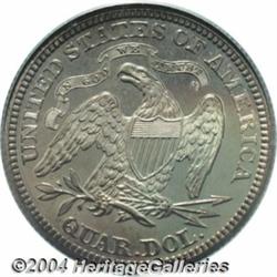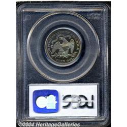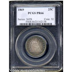 <B>1869<25C> PR66 PCGS.</B></I> Like the other P-mint Motto Seated Quarters from the 1860s, the 1869 was produced in limited numbers as a business strike (in this case, only 16,000 pieces). As a result, date collectors seeking to complete high-quality sets are often forced to call upon exceptionally well preserved proofs to represent this issue. This survivor from a proof mintage of 600 pieces is a perfect candidate. The design features are well struck throughout, for the most part revealing razor-sharp detail. A rich layer of crimson-gray toning is framed by steel-blue coloration at the margins on the obverse. The reverse toning is similar, but much lighter, allowing the proof fields on this side to realize a somewhat greater intensity of brilliance. The lovingly preserved surfaces are virtually devoid of any serious contact marks. Population: 3 in 66, 0 finer (3/04).<BR><I>From the JFS Collection.</B></I> <BR><BR><B>Important notice:</B> Heritage usually auctions material at the rate of 200-250 lots per hour. On some occasions eBay Live bid software or the Internet may not be able to keep up with the pace of the auction. We recommend placing a realistic absentee bid now as insurance to avoid disappointment. Occasionally the auctioneer may eliminate or reject an eBay Live bid, and the auctioneer may also reopen a lot after the close of the eBay live bidding (usually because we missed an audience bid), and may reject your bid even if it shows you as the winning bidder. By bidding via eBay Live, you agree that Heritage may award the lot to another bidder at its sole discretion under the circumstances described above or any other reasonable circumstances. Since eBay bids are not shown to us until we open the lot on the floor, we treat those bids just like floor bids. In most cases the floor responds before the eBay bid is presented to us, due to Internet lag time, so for consistency we have made it a policy that floor bids are always considered first over tie eBay live bids. Also please note that all Heritage lots purchased through eBay Live carry a 20% Buyer's Premium. Please make sure you read the Terms and Conditions before you bid. </span></font></tr></table></td></tr></table>