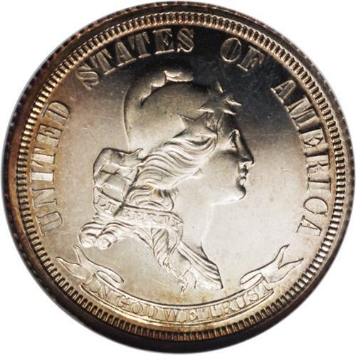 <B>1869<25C> Standard Silver Quarter Dollar, Judd-721, Pollock-802, R.5, PR66 Cameo NGC.</B></I> The obverse features a bust of Liberty wearing a cap ornamented with three stars, facing right, the legend UNITED STATES OF AMERICA surrounds the figure, and a scroll with IN GOD WE TRUST is below. The reverse depicts 25 CENTS centered in a wreath of oak and laurel leaves with STANDARD SILVER above and the date 1869 below. Struck in silver with a reeded edge. An amazing example of this relatively plentiful pattern variety. Although it is hardly a rarity, examples are almost never found so nice, with such excellent eye appeal. Both sides have deeply mirrored fields and highly lustrous devices with pale champagne toning, a little deeper at the borders. Census: 4 in 66, 0 finer (1/06).