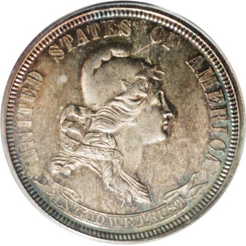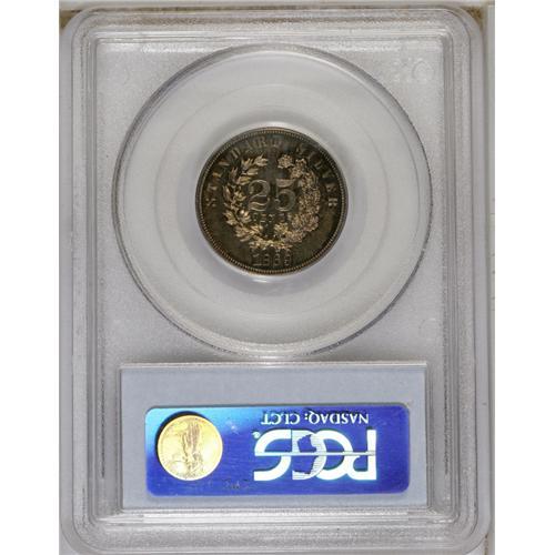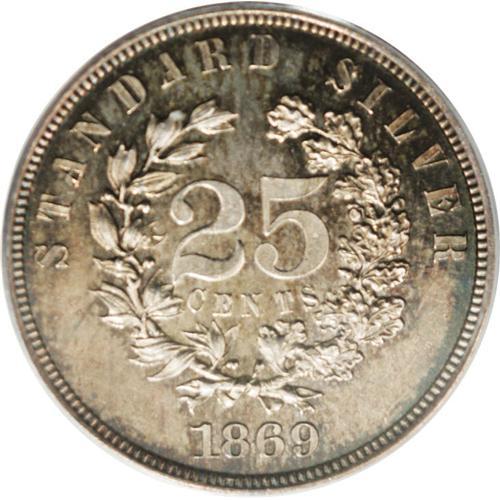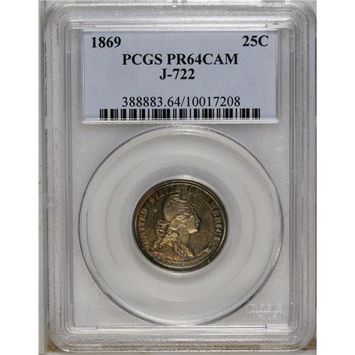 <B>1869 25C Standard Silver Quarter Dollar, Judd-722, Pollock-803, High R.6, PR64 Cameo PCGS.</B></I> Standard Silver design with Liberty wearing a diadem and scroll below; the reverse reads "STANDARD SILVER 1869" around the rim, with "25 CENTS" in the center of an oak and laurel wreath. Struck in silver with a plain edge. A needle-sharp and richly toned specimen whose grade is limited by a pair of short pinscratches on the upper obverse. Both sides display frosted devices and pleasing cameo contrast.<BR><BR><b>Shipping:</b> Coins & Currency (<a target="_blank" href="http://www.heritageauctions.com/common/shipping.php">view shipping information</a>)