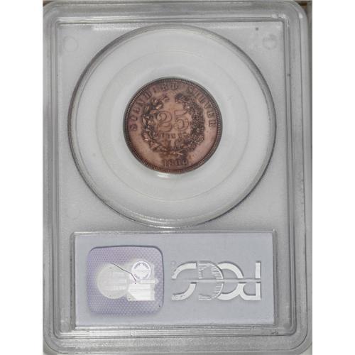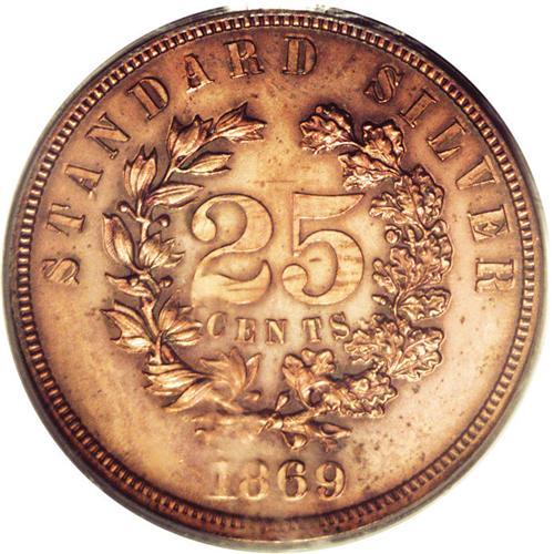 <B>1869<25C> Standard Silver Quarter Dollar, Judd-724, Pollock-805, R.7, PR63 Red PCGS.</B></I> The obverse features a bust of Liberty wearing a cap ornamented with three stars, facing right. The legend UNITED STATES OF AMERICA surrounds the figure, and a scroll with IN GOD WE TRUST is below. The reverse depicts 25 CENTS centered in a wreath of oak and laurel leaves with STANDARD SILVER above and the date 1869 below. Struck in copper with a plain edge. This well struck specimen is pale salmon-pink aside from a few tiny gray spots on the lower obverse.