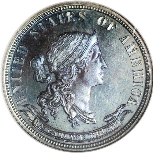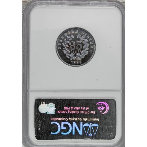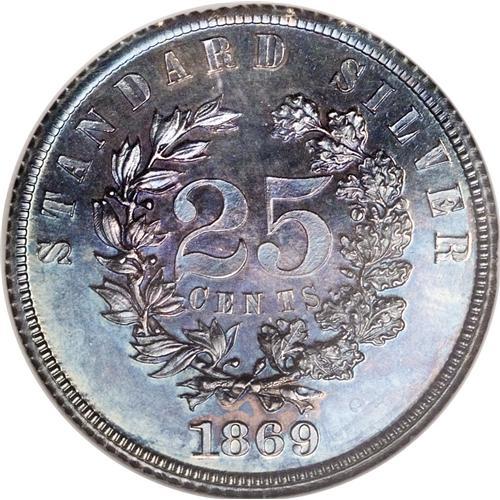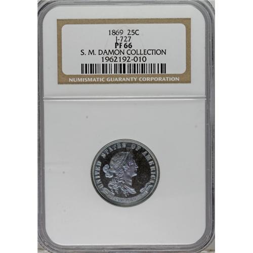 <B>1869 25C Standard Silver Quarter Dollar, Judd-727, Pollock-808, R.5, PR66 NGC.</B></I> Ex: S.M. Damon Collection. Liberty's hair is bound, and she wears a diadem. The obverse exergue displays IN GOD WE TRUST within a scroll. The date is instead on the reverse exergue. A small oak and laurel wreath crowds the centrally placed 25 CENTS. STANDARD SILVER dominates the upper reverse border. Struck in silver with a reeded edge. This remarkably preserved and well struck ocean-blue Premium Gem offers occasional peach and plum tints.<BR><BR><b>Shipping:</b> Coins & Currency (<a target="_blank" href="http://www.heritageauctions.com/common/shipping.php">view shipping information</a>)