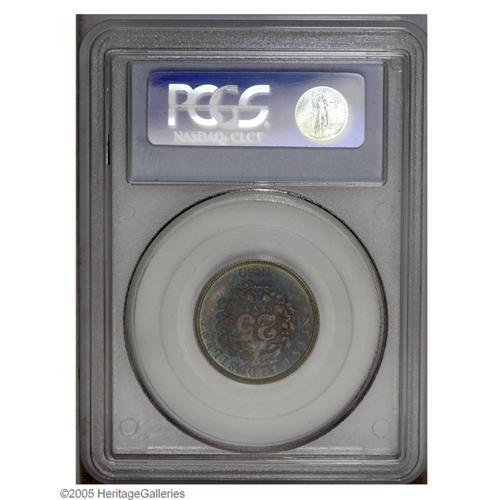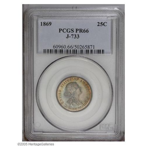 <B>1869<25C> Standard Silver Quarter Dollar, Judd-733, Pollock-814, R.5, PR66 PCGS.</B></I> Standard Silver design with the bust of Liberty facing right, wearing a headband with LIBERTY inscribed upon it. UNITED STATES OF AMERICA surrounds most of the obverse margin with the motto set on a scroll below the bust of Liberty. On the reverse, 25 CENTS is surrounded by a wreath of oak and laurel leaves, and around the periphery is STANDARD SILVER 1869. Struck in silver with a reeded edge. This is a splendid Gem quality example with mirrored fields and lustrous devices beneath exceptional lilac, gold, blue, and iridescent toning on both surfaces. A highly appealing example representative of the extensive Standard Silver series of pattern coinage.