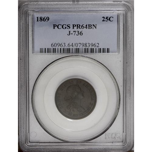 <B>1869<25C> Standard Silver Quarter Dollar, Judd-736, Pollock-817, Low R.7, PR64 Brown PCGS.</B></I> This Standard Silver entry features a high relief portrait of Liberty with a large star above her forehead. Struck in copper with a plain edge. Chocolate-brown colored on the obverse with reverse surfaces that remain lighter in color. The surfaces are quite appealing for the grade with one curvy lintmark to the right of Liberty's neck being the most significant disturbance in the fields.