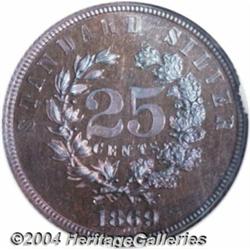 <table><tr><td><table><tr><td>1869 25C Standard Silver Quarter Dollar, Judd-723, Pollock-804, R.6, PR67 Red and Brown NGC. Standard Silver pattern with a depiction of Liberty facing right on the obverse and wearing a cap ornamented with three stars. The center of the reverse reads 25 CENTS and is surrounded by an oak and laurel wreath with STANDARD SILVER above and the date below. Struck in copper with a reeded edge. The peerless surfaces on this coin show deep mirrors in the fields and there is a lovely intermixture of Prussian blue with the cherry-red color on each side. An exceptional, problem-free Standard Silver pattern. <BR><BR><B>Important notice:</B> Heritage usually auctions material at the rate of 200-250 lots per hour. On some occasions eBay Live bid software or the Internet may not be able to keep up with the pace of the auction. We recommend placing a realistic absentee bid now as insurance to avoid disappointment. Occasionally the auctioneer may eliminate or reject an eBay Live bid, and the auctioneer may also reopen a lot after the close of the eBay live bidding (usually because we missed an audience bid), and may reject your bid even if it shows you as the winning bidder. By bidding via eBay Live, you agree that Heritage may award the lot to another bidder at its sole discretion under the circumstances described above or any other reasonable circumstances. Since eBay bids are not shown to us until we open the lot on the floor, we treat those bids just like floor bids. In most cases the floor responds before the eBay bid is presented to us, due to Internet lag time, so for consistency we have made it a policy that floor bids are always considered first over tie eBay live bids. Also please note that all Heritage lots purchased through eBay Live carry a 20% Buyer's Premium. Please make sure you read the Terms and Conditions before you bid. <BR><BR><B>IMPORTANT ANNOUNCEMENT ABOUT RESERVES:</B> Heritage now divulges all reserves on its web site 7 days before every auction. If you want to know whether the reserve on this lot has been met, and if not, what the reserve amount is, please visit this lot page on the HeritageCoin.com web site, or email: bid@HeritageGalleries.com </span></font></td></tr></table></td></tr></table>