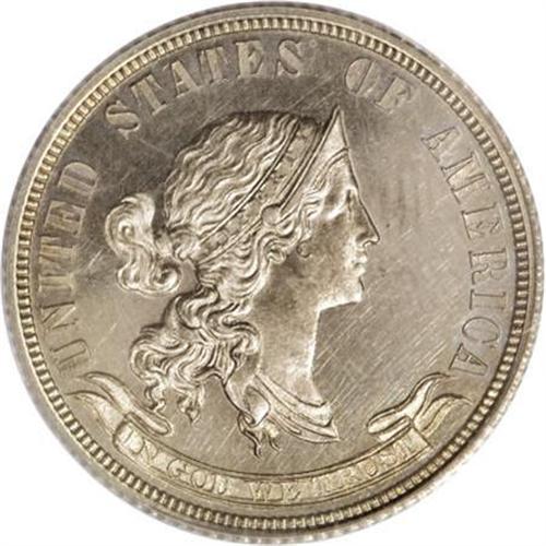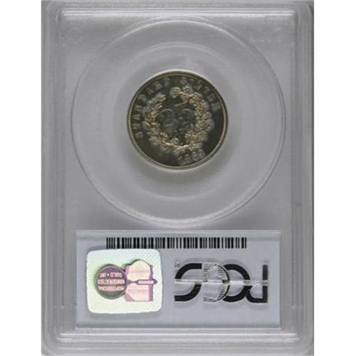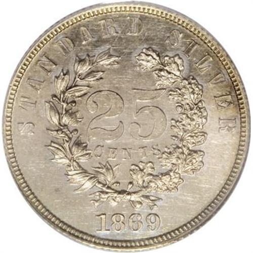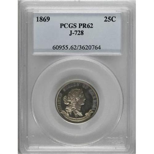 <B>1869 25C Standard Silver Quarter Dollar, Judd-728, Pollock-809, High R.6, PR62 PCGS.</B></I> On the obverse, Liberty wears a diadem inscribed LIBERTY with her hair tied in a bun facing right. IN GOD WE TRUST resides on a scroll below. On the reverse, the denomination 25 CENTS is centered in a wreath of oak and laurel leaves with STANDARD SILVER above and the date below. Struck in silver with a plain edge. A well struck and only faintly toned specimen with wispy hairlines on both fields.<BR><BR><b>Shipping:</b> Coins & Currency (<a target="_blank" href="http://www.heritageauctions.com/common/shipping.php">view shipping information</a>)