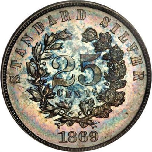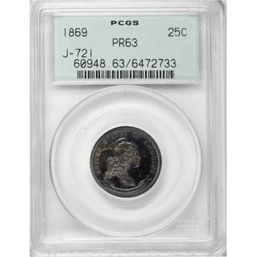 <B>1869 25C Standard Silver Quarter Dollar, Judd-721, Pollock-802, R.5, PR63 PCGS.</B></I> The obverse features a bust right of Liberty wearing a cap ornamented with three stars. A scroll bearing IN GOD WE TRUST is below. The reverse depicts 25 CENTS centered in a small wreath of oak and laurel leaves with STANDARD SILVER above and the date 1869 below. Struck in silver with a reeded edge. Light, attractive iridescent toning is seen over each side with strong reflectivity in the fields. <BR><BR><b>Shipping:</b> Coins & Currency (<a target="_blank" href="http://www.heritageauctions.com/common/shipping.php">view shipping information</a>)
