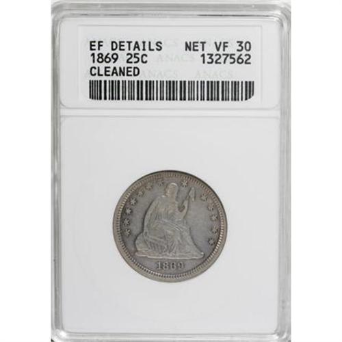 <B>1869 25C --Cleaned--ANACS. XF Details Net VF30.</B></I> NGC Census: (0/15). PCGS Population (2/15). Mintage: 16,000. Numismedia Wsl. Price for NGC/PCGS coin in VF30: $479. (#5474)<BR><BR><B>Coin Engraver:</B> Christian Gobrecht<BR><BR><b>Shipping:</b> Coins & Currency (<a target="_blank" href="http://www.heritageauctions.com/common/shipping.php">view shipping information</a>\)