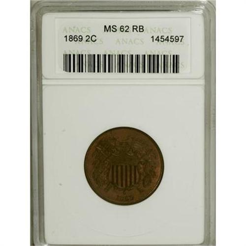 <B>1869 2C MS62 Red and Brown ANACS.</B></I> NGC Census: (2/145). PCGS Population (7/186). Mintage: 1,546,500. Numismedia Wsl. Price for NGC/PCGS coin in MS62: $150. (#3604)<BR><BR><b>Shipping:</b> Coins & Currency (<a target="_blank" href="http://www.heritageauctions.com/common/shipping.php">view shipping information</a>)