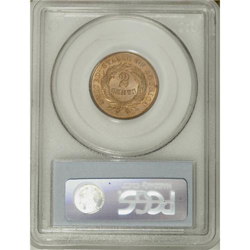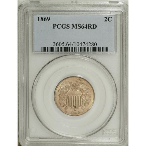 <B>1869 2C MS64 Red PCGS.</B></I> Both sides are enveloped in attractive copper-gold patina, and exhibit sharply struck design elements. A few light toning spots are scattered about.<BR><BR><b>Shipping:</b> Coin/Currency (<a target="_blank" href="http://www.heritageauctions.com/common/shipping.php">view shipping information</a>)