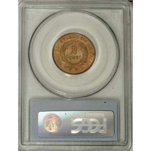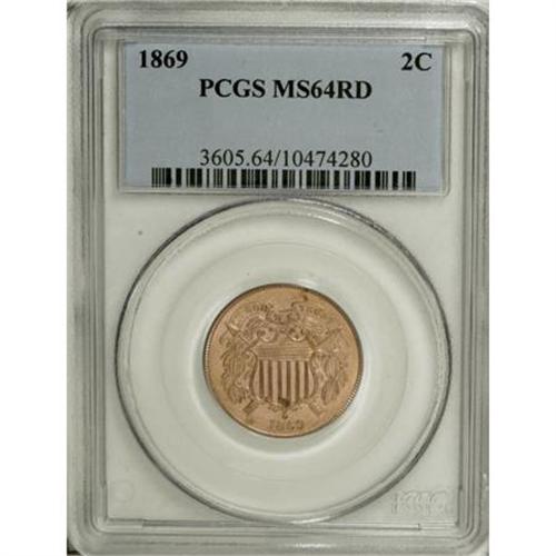 <B>1869 2C MS64 Red PCGS.</B></I> A lovely copper-gold near-Gem that offers pale, pleasingly preserved surfaces and remarkable overall eye appeal. Tiny spots of deeper toning at the margins do not detract. Population: 30 in 64 Red, 27 finer (2/08).<BR><BR><B>Coin Engraver:</B> James B. Longacre<BR><BR><b>Shipping:</b> Coins & Currency (<a target="_blank" href="http://www.heritageauctions.com/common/shipping.php">view shipping information</a>)