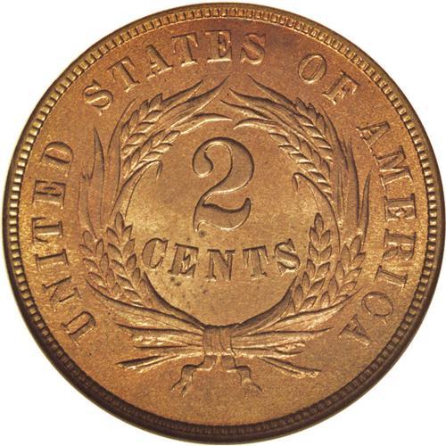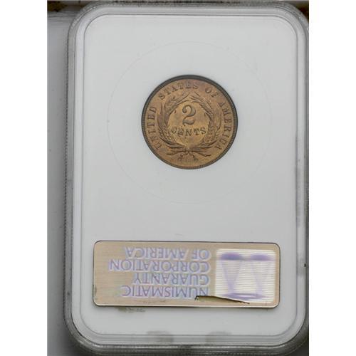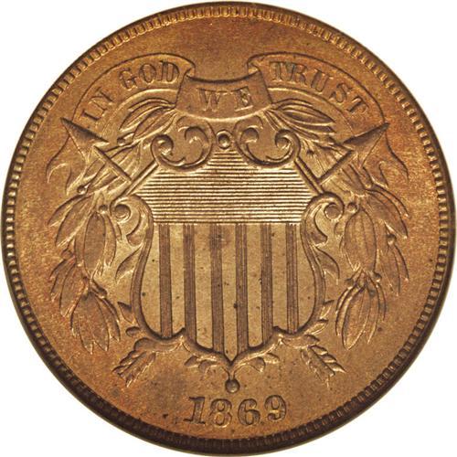 <B>1869<2C> MS65 Red NGC.</B></I> Sharply defined with smooth, even reddish-orange color throughout and just the slightest amount of light tan muting. Sharply defined throughout with no mentionable marks or abrasions. The only disturbances in the flow of the mint luster are a few small carbon spots on each side. A well preserved example that is housed in an earlier NGC holder with a light green insert. Census: 16 in 65, 2 finer (6/06).