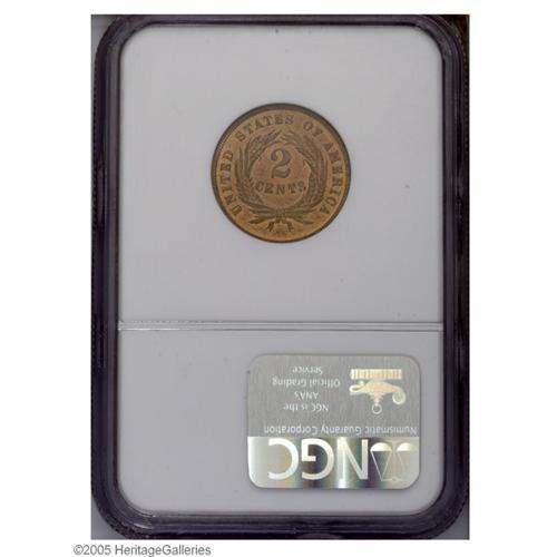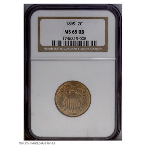 <B>1869<2C> MS65 Red and Brown NGC.</B></I> Well struck with rich reddish-golden color and blemish-free surfaces. Scattered flyspecks, on each side, and a faint partial fingerprint, just below 12 o'clock on the obverse rim, prevent an even loftier grade designation. Population: 57 in 65 Red and Brown, 12 finer in Red and Brown (10/05).<BR><I>From The Hensley Collection.</B></I>