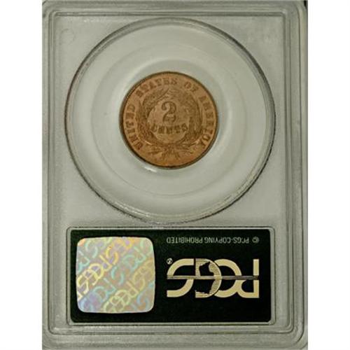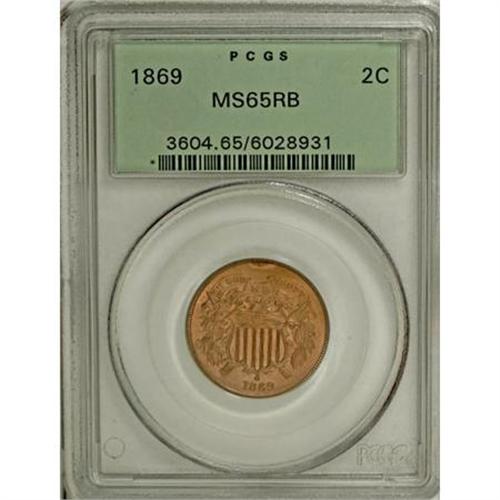 <B>1869 2C MS65 Red and Brown PCGS.</B></I> This is a well produced specimen with surprisingly light coloration and just a few wisps of carbon on each side. A minor planchet flaw is located at 12 o'clock on the obverse rim. There are no contact marks on either side. <BR><BR><B>Coin Engraver:</B> James B. Longacre<BR><BR><b>Shipping:</b> Coins & Currency (<a target="_blank" href="http://www.heritageauctions.com/common/shipping.php">view shipping information</a>)