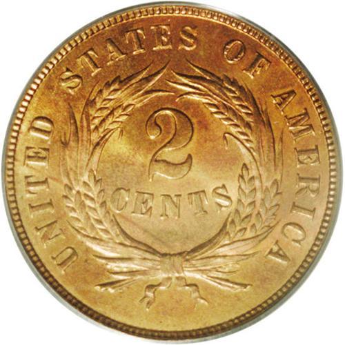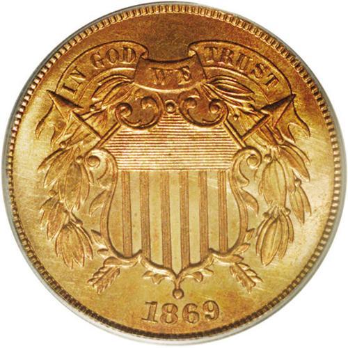 <B>1869<2C> MS66 Red PCGS.</B></I> Only two examples of this issue have been graded so high by PCGS, and this one is housed in an older green-label holder. It is highly lustrous with soft, frosty surfaces and exceptional orange color. The reverse has slightly deeper lilac color at the center. An amazing example that provides the Registry collector with an opportunity to add to, or upgrade, his or her collection.<BR><I>From The David L. Goodwin Collection.</B></I> <BR><BR><B>Important notice:</B> Heritage usually auctions material at the rate of 200-250 lots per hour. On some occasions eBay Live bid software or the Internet may not be able to keep up with the pace of the auction. We recommend placing a realistic absentee bid now as insurance to avoid disappointment. Occasionally the auctioneer may eliminate or reject an eBay Live bid, and the auctioneer may also reopen a lot after the close of the eBay live bidding (usually because we missed an audience bid), and may reject your bid even if it shows you as the winning bidder. By bidding via eBay Live, you agree that Heritage may award the lot to another bidder at its sole discretion under the circumstances described above or any other reasonable circumstances. Since eBay bids are not shown to us until we open the lot on the floor, we treat those bids just like floor bids. In most cases the floor responds before the eBay bid is presented to us, due to Internet lag time, so for consistency we have made it a policy that floor bids are always considered first over tie eBay live bids. Also please note that all Heritage lots purchased through eBay Live carry a 20% Buyer's Premium. Please make sure you read the Terms and Conditions before you bid. This lot is being auctioned in conjunction with a live floor auction by Heritage Galleries & Auctioneers. All final auction and invoice information will be supplied by Heritage Galleries & Auctioneers, and all other information should be considered preliminary. Lot:734 <BR><BR><B>Winning Notification and Billing:</B> After the FINAL session in this auction is complete, Heritage will send e-mail and snail mail invoices. This process normally takes several days. All final auction and invoice information will be supplied by Heritage Galleries & Auctioneers, and all other information should be considered preliminary. <BR><BR>This auction will be conducted on a live auction floor and over the Internet through eBay Live. If you choose to place an absentee bid, please take a moment to <font color='#0000ff'><u><a href='http://pages.ebay.com/liveauctions/help/before/laabsentee.html'>learn how eBay Live absentee bidding works</a></u></font><font color='#000000'>