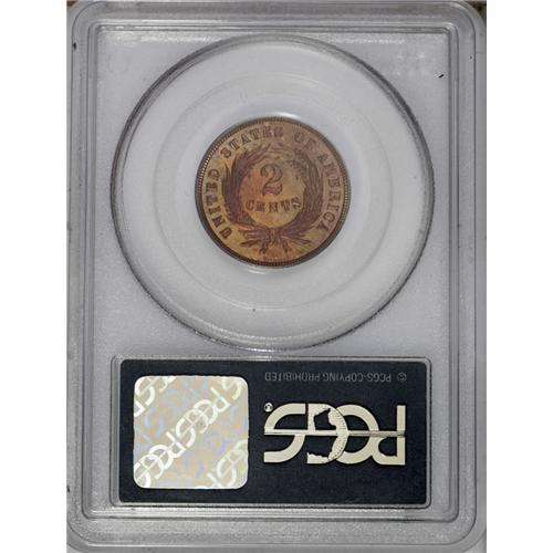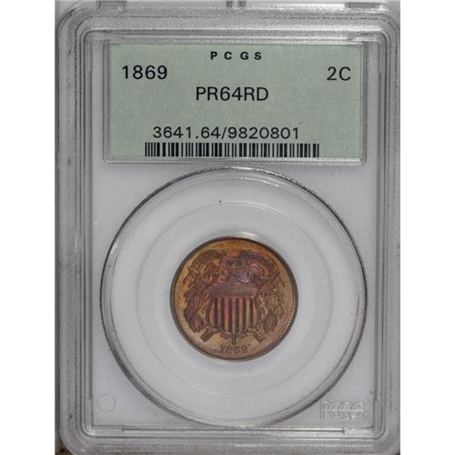 <B>1869 2C PR64 Red PCGS.</B></I> The surfaces are largely warm mahogany-orange, only slightly mellowed. A patch of magenta appears near the WE on the banner, and light hairlines are present on the obverse. Population: 38 in 64 Red, 50 finer (10/06).<BR><BR><b>Shipping:</b> Coin/Currency (<a target="_blank" href="http://www.heritageauctions.com/common/shipping.php">view shipping information</a>)