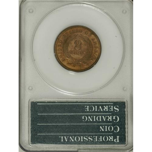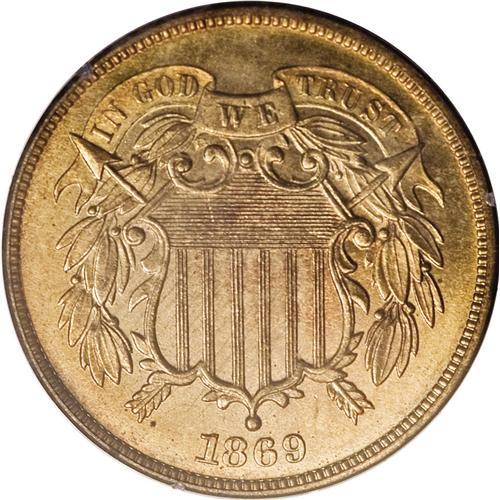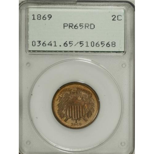 <B>1869 2C PR65 Red PCGS.</B></I> Six hundred or so proof two cent pieces were struck in 1869. Nearly 500 examples have been seen by PCGS and NGC to date, of which about 130 or so are in the Red classification. The current PR65 Red specimen displays orange-gold surfaces with light green and crimson accents, and the design features are sharply impressed throughout. A few inoffensive obverse flecks are noted, and there are no mentionable contact marks. A small lamination below the CEN of CENTS may help to pedigree this particular piece that generates great overall eye appeal. Housed a first generation PCGS holder. Population: 40 in 65 Red, 10 finer (2/07).<BR><BR><b>Shipping:</b> Coins & Currency (<a target="_blank" href="http://www.heritageauctions.com/common/shipping.php">view shipping information</a>)