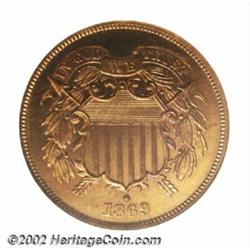 1869 2C PR66 Red NGC. A boldly struck Gem with radiant rose-gold color. The surfaces are carbon-free