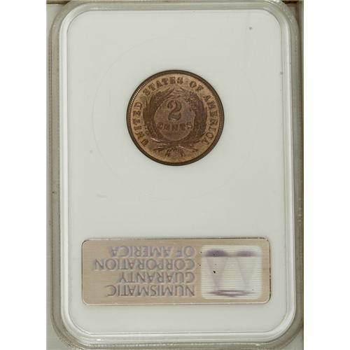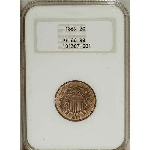 <B>1869<2C> PR66 Red and Brown NGC.</B></I> The design elements are sharply struck and each side of the coin displays beautifully rich golden-red coloration. The fields exhibit nice reflectivity and there are no bothersome hairlines or handling marks to be found. Census: 23 in 66, 1 finer (8/06).
