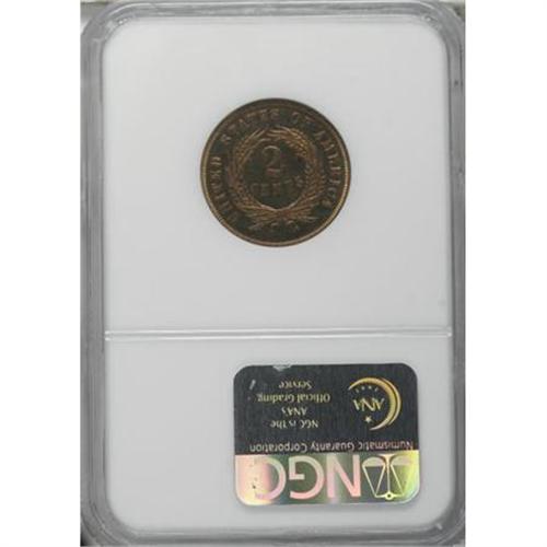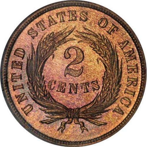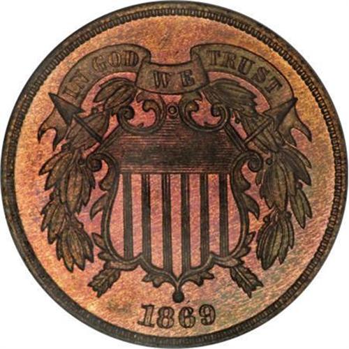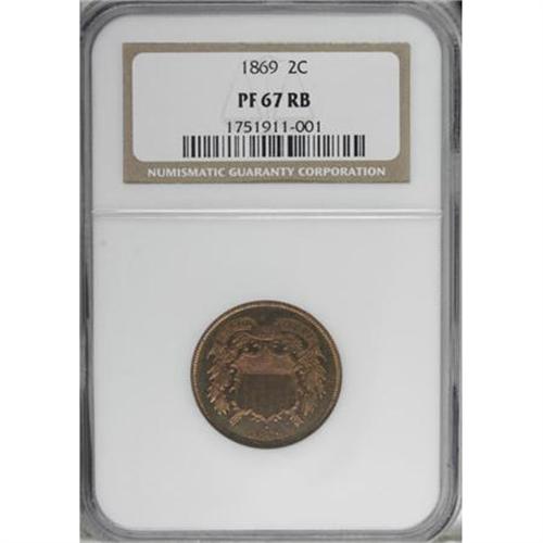 <B>1869 2C PR67 Red and Brown NGC.</B></I> A rich blend of orange and magenta coats both sides of this very appealing Proof. To the unaided eye, the surfaces approach flawless and the strike provides full details in the shield and on the wreath. The color is even and just a bit too mellow to allow for a full Red designation. Only 600 proofs are believed to have been struck of this issue, and few could rival this coin.<BR><BR><B>Coin Engraver:</B> James B. Longacre<BR><BR><b>Shipping:</b> Coins & Currency (<a target="_blank" href="http://www.heritageauctions.com/common/shipping.php">view shipping information</a>)