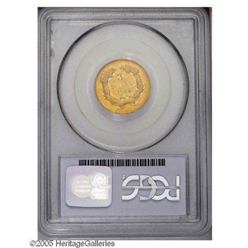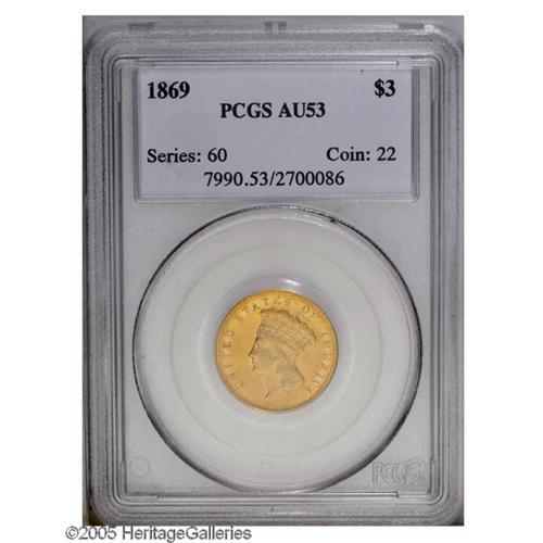 1869 $3 AU53 PCGS. A very scarce coin, boasting a mint 1869[$3] AU53 PCGS.