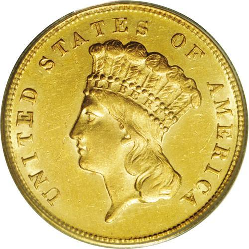 1869 $3 AU58 PCGS. Delightful peach-gold and green ton 1869[$3] AU58 PCGS.