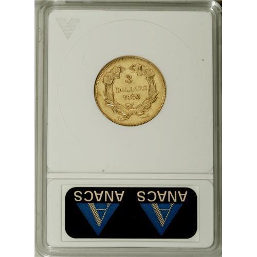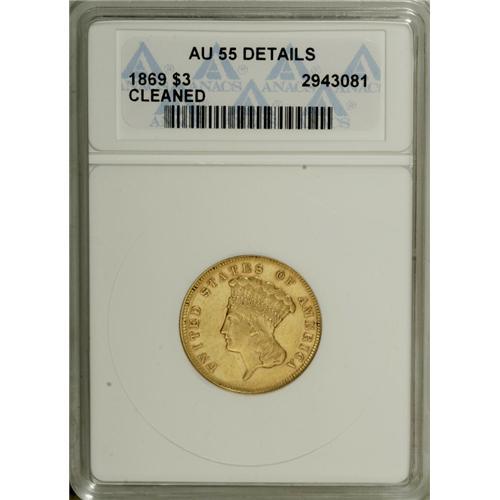 <B>1869 $3 --Cleaned--ANACS. AU55 Details.</B></I> This briefly circulated example has substantial peripheral luster, and no distracting hairlines are present. Slightly bright, however, and a speck of glue or lacquer is noted on the reverse near 9 o'clock.<BR><BR><b>Shipping:</b> Coins & Currency (<a target="_blank" href="http://www.heritageauctions.com/common/shipping.php">view shipping information</a>)