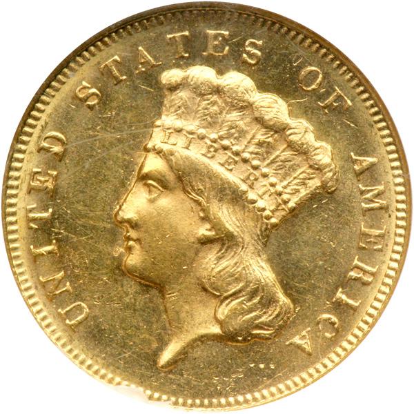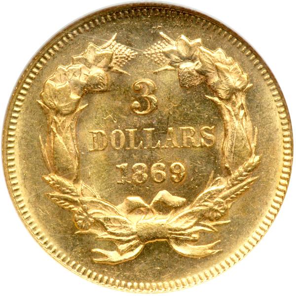 1869 $3 Gold. NGC graded MS-63. Mostly untoned with semi-reflective surfaces. Only 2,500 pieces struck. A brilliant, lustrous specimen with a generous amount of prooflike surface on both sides. The strike is above average, but with some softness on the high parts of Liberty's hair near the center. The reverse is quite sharp, not perfect, but close.