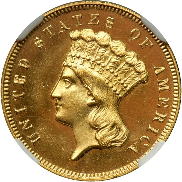 The origins of this odd denomination stretch all the way back to 1832, when Representative Campbell P. White of New York introduced a bill calling for minting of a Three-Dollar gold piece with a weight of 75 grains. The bill never reached a vote, however, and it would be several years before the federal government returned to the idea of authorizing a Three-Dollar gold piece. In 1851, Congress reduced the postal letter rate to three cents while simultaneously authorizing the Mint to strike Three-Cent pieces in base silver to expedite purchase of stamps. The Mint Act of February 21, 1853, while best known for reducing the weight of most silver coins and adding arrows at both sides of their dates, also included a clause authorizing production of a Three-Dollar gold piece. Apparently, Congressional leaders anticipated that this denomination would expedite exchange of Three-Cent silver rolls and/or purchase of full sheets of Three-Cent stamps. Business strikes and Proofs were produced every year from 1854 through 1889 with the exception of 1875 and 1876, when only Proofs were struck. Pop 1; none finer.