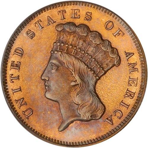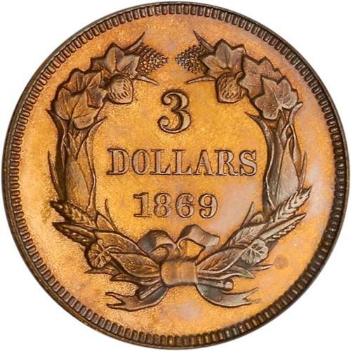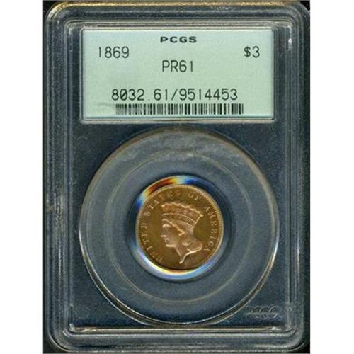 <b>1869 $3 Gold. PCGS graded Proof 61.</b> Pop: 1/7. An extremely rare piece of Proof gold from the 1860s, from the same consignor Proof gold dollars and quarter eagle rarities in the Wasatch Collection. Only 25 Proofs were struck of the 1869, and a reasonable guess would place the number extant today between 10 and 15 pieces. A bit more harshly cleaned than usual, the fields still retain good depth of mirrored reflectivity and both sides are draped in a heavy layering of reddish patination. Actually, the coin looks nicer than the stated grade.