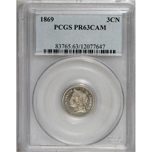 <B>1869 3CN PR63 Cameo PCGS.</B></I> PCGS Population (1/53). NGC Census: (3/77). (#83765)<BR><BR><b>Shipping:</b> Coins & Currency (<a target="_blank" href="http://www.heritageauctions.com/common/shipping.php">view shipping information</a>)