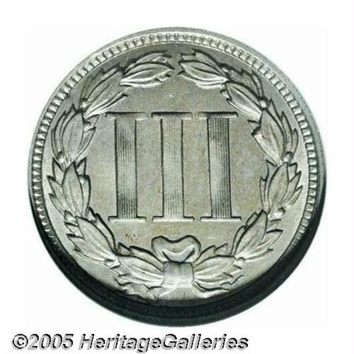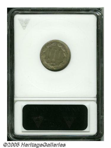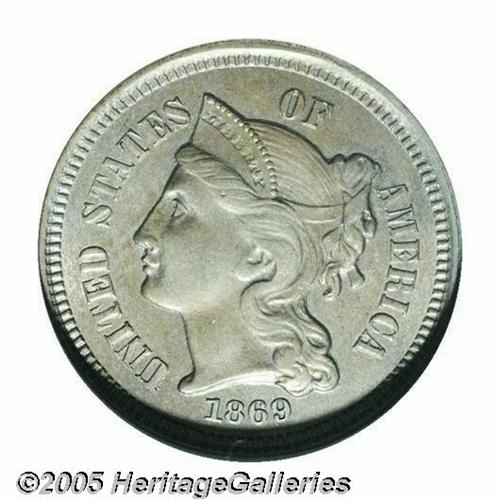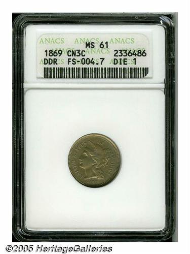 <B>1869<3CN> MS61 ANACS.</B></I> Doubled Die Reverse, FS-004.7, Die 1. An average or better strike with glossy surfaces beneath steel-gray and amber patina.<BR><I>From The Western Hills Collection.</B></I>