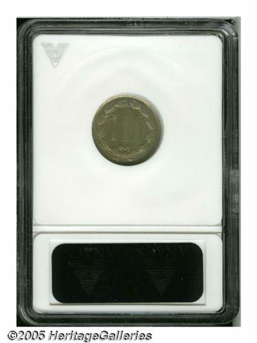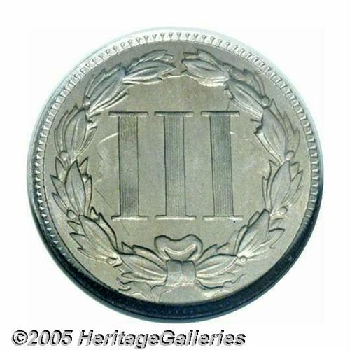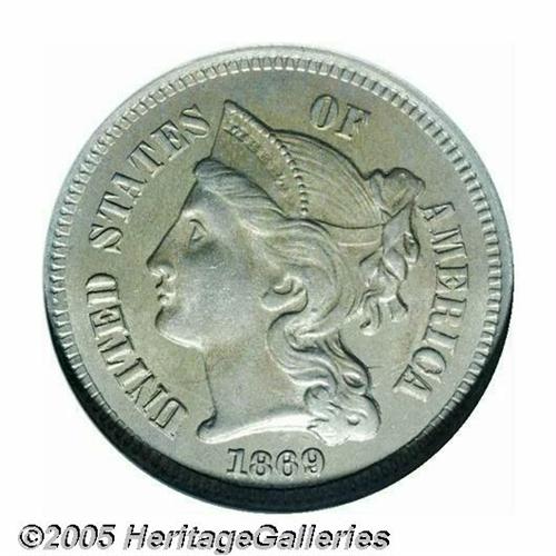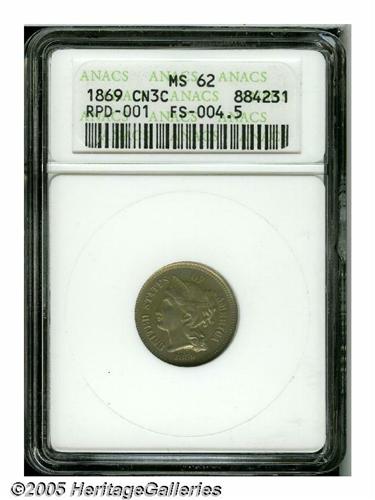<B>1869<3CN> MS62 ANACS.</B></I> Repunched Date. FS-004.5. All four digits are widely repunched south. Gray and apricot patina adorns both sides, while die clash marks are clearly visible in the fields.<BR><I>From The Western Hills Collection.</B></I>