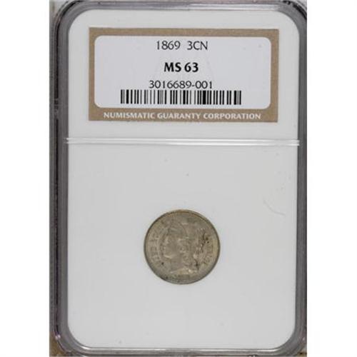 <B>1869 3CN MS63 NGC.</B></I> NGC Census: (54/167). PCGS Population (59/144). Mintage: 1,604,000. Numismedia Wsl. Price for NGC/PCGS coin in MS63: $150. (#3735)<BR><BR><b>Shipping:</b> Coins & Currency (<a target="_blank" href="http://www.heritageauctions.com/common/shipping.php">view shipping information</a>)