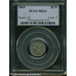 1869 3CN MS64 PCGS. Light gray patina displays som <B>1869 3CN MS64 PCGS.</B></I> Light gray patina displays some flecks scattered about each side. The design elements are adequately struck, except for weakness in the lines of the III. Population: 80 in 64, 52 finer (11/04). <BR><BR><B>Important notice:</B> Heritage usually auctions material at the rate of 200-250 lots per hour. On some occasions eBay Live bid software or the Internet may not be able to keep up with the pace of the auction. We recommend placing a realistic absentee bid now as insurance to avoid disappointment. Occasionally the auctioneer may eliminate or reject an eBay Live bid, and the auctioneer may also reopen a lot after the close of the eBay live bidding (usually because we missed an audience bid), and may reject your bid even if it shows you as the winning bidder. By bidding via eBay Live, you agree that Heritage may award the lot to another bidder at its sole discretion under the circumstances described above or any other reasonable circumstances. Since eBay bids are not shown to us until we open the lot on the floor, we treat those bids just like floor bids. In most cases the floor responds before the eBay bid is presented to us, due to Internet lag time, so for consistency we have made it a policy that floor bids are always considered first over tie eBay live bids. Also please note that all Heritage lots purchased through eBay Live carry a 20% Buyer's Premium. Please make sure you read the Terms and Conditions before you bid. This lot is being auctioned in conjunction with a live floor auction by Heritage Galleries & Auctioneers. All final auction and invoice information will be supplied by Heritage Galleries & Auctioneers, and all other information should be considered preliminary. Lot:5490