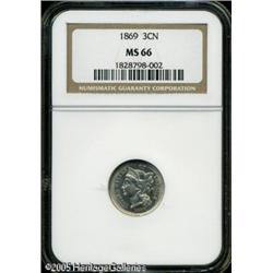 <B>1869 3CN MS66 NGC.</B></I> A sharply struck Gem with satiny gray luster. Population: 16 in 66, 0 finer (1/05). Lot:5698