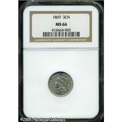 <B>1869 3CN MS66 NGC.</B></I> This example is tied for the finest of the date certified by either PCGS or NGC. It has frosty light gray color with excellent eye appeal. Population: 16 in 66, 0 finer (1/05). Lot:5699