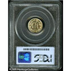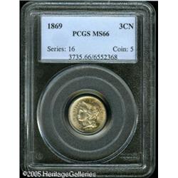 <B>1869 3CN MS66 PCGS.</B></I> This is a gorgeous Gem quality example with frosty gray color and splashes of gold toning on the obverse. Population: 11 in 66, 0 finer (1/05). Lot:5700