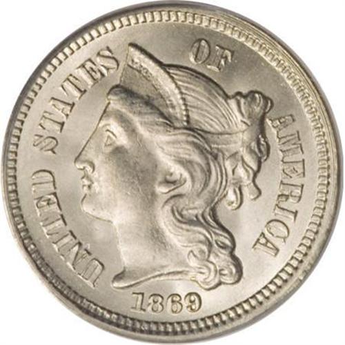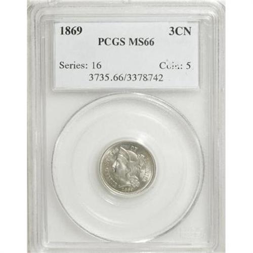 <B>1869 3CN MS66 PCGS.</B></I> A thin layer of champagne-gold patina resides on the fully lustrous, well preserved surfaces of this Premium Gem. An exquisite strike sharpens the design features. Mintages of the three cent nickel declined every year between 1865 and 1871, likely due to commercial demand for the Shield nickel. Population: 16 in 66, 0 finer (12/07).<BR><BR><B>Coin Engraver:</B> James B. Longacre<BR><BR><b>Shipping:</b> Coins & Currency (<a target="_blank" href="http://www.heritageauctions.com/common/shipping.php">view shipping information</a>)